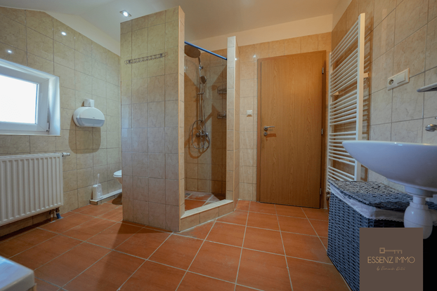 Das vom Flur auf der linken Seite zugängliche Badezimmer ist mit einer Dusche, einem Waschbecken, Badezimmermöbeln und einer automatischen Waschmaschine ausgestattet.